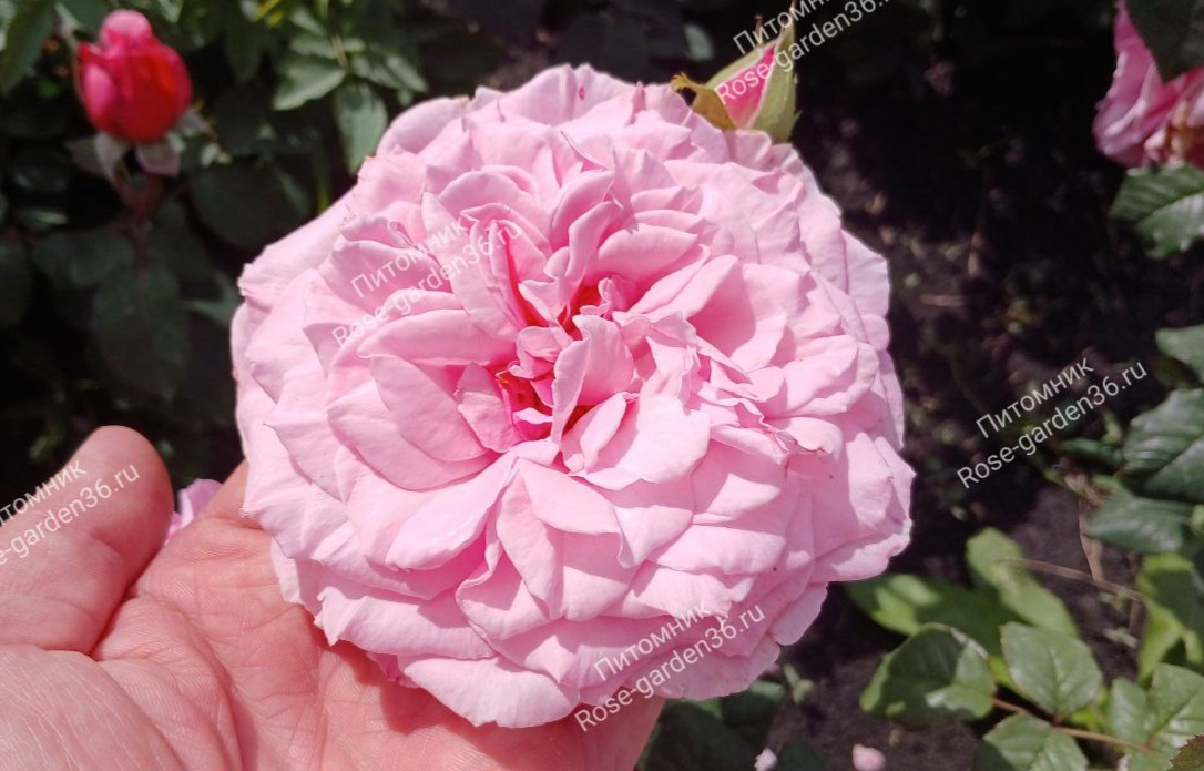 Розовый цвет. Сильный аромат. Очень махровая форма цветка. Цветет волнами в течение сезона.