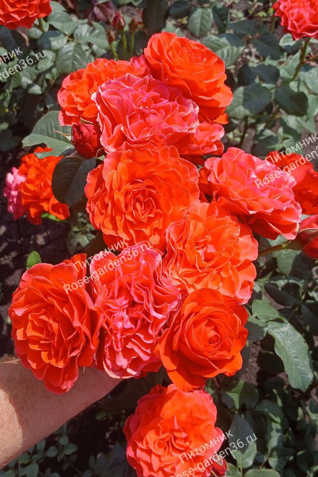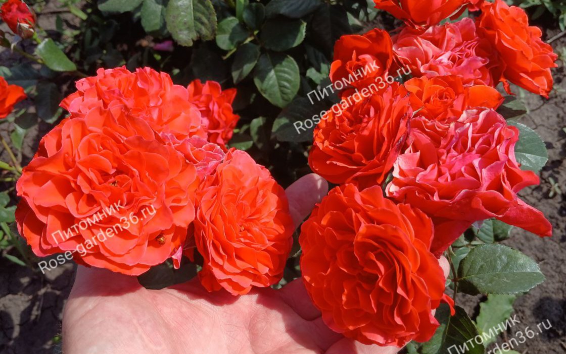 Густомахровые, розетковидные оранжево-коралловые розы диаметром около 6 см расположены на стеблях соцветиями по 5-7 штук. Лепестки нежные, с волнистыми краями, в розетке их 80-100 штук.